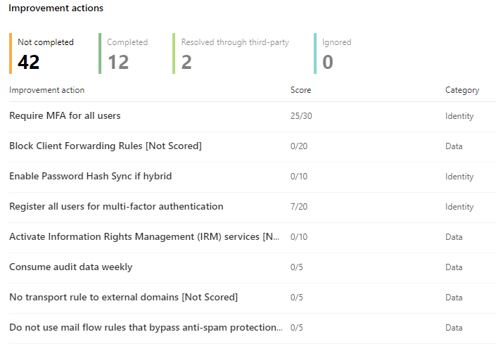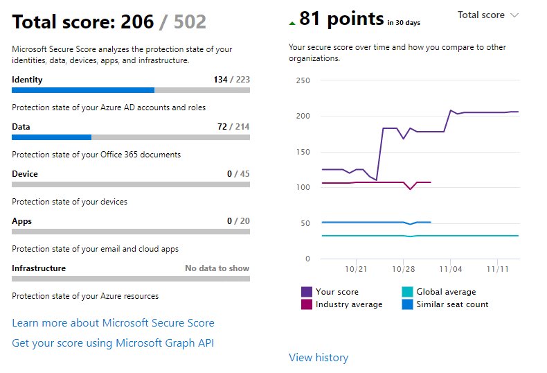 Your Office 365 service includes a security analytics tool called Microsoft Security Score. This is a rated points-based system for Office and Microsoft online services is a snapshot of how secure your environment is. Looking at the scores, the Microsoft global average security score is a whopping 32 out of 500 points at the time of writing this article!